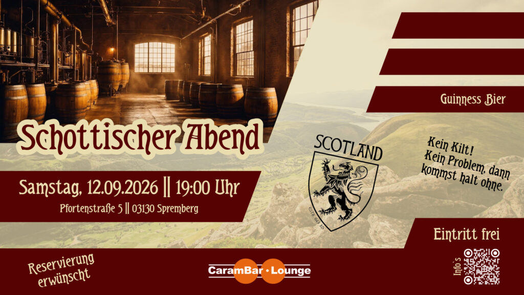 Genieße edle Whiskys, deftigen schottischen Eintopf und Guinness Bier.